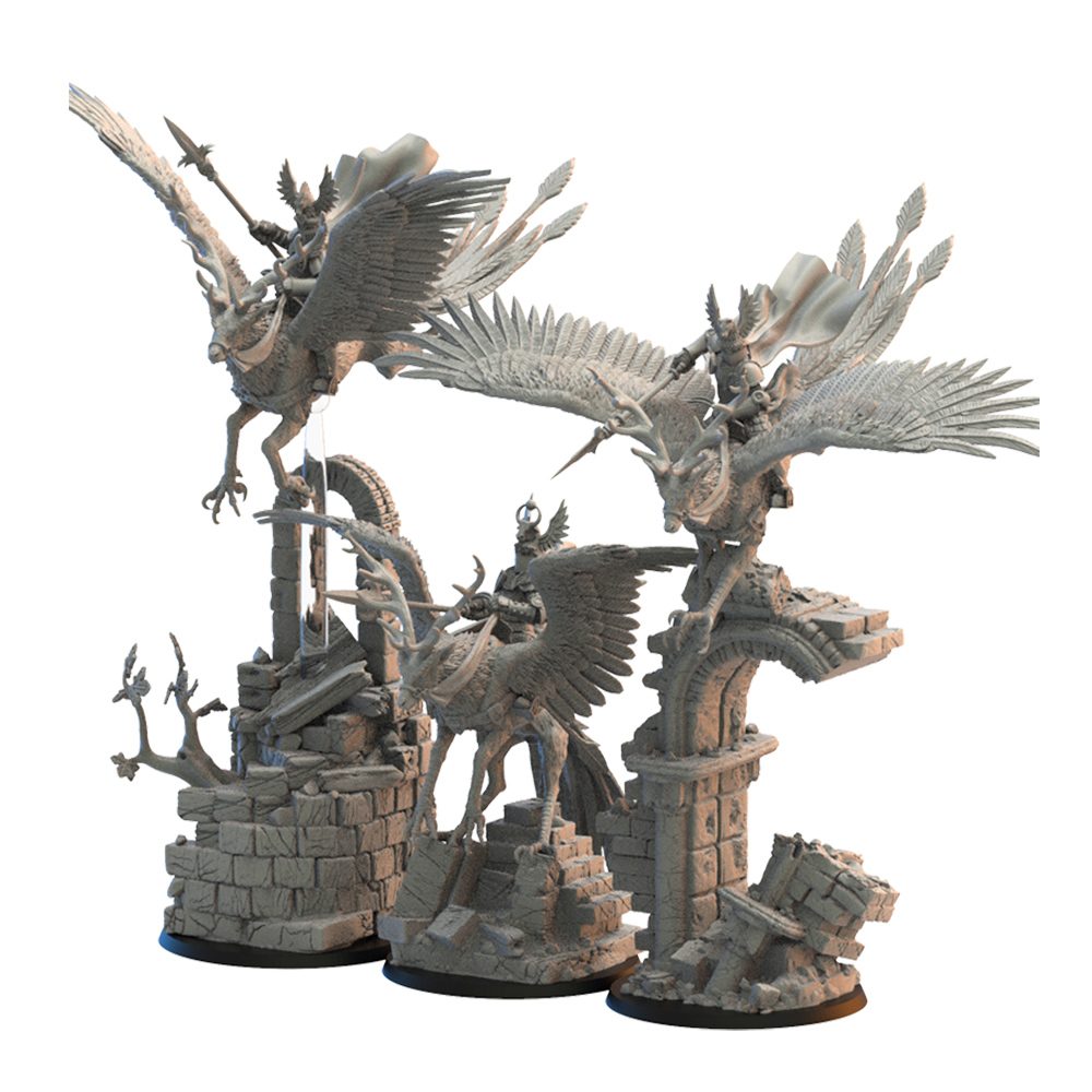 Contient les éléments nécessaires au montage de trois chevaliers sur bêtes ailées et de leur socle scénique.