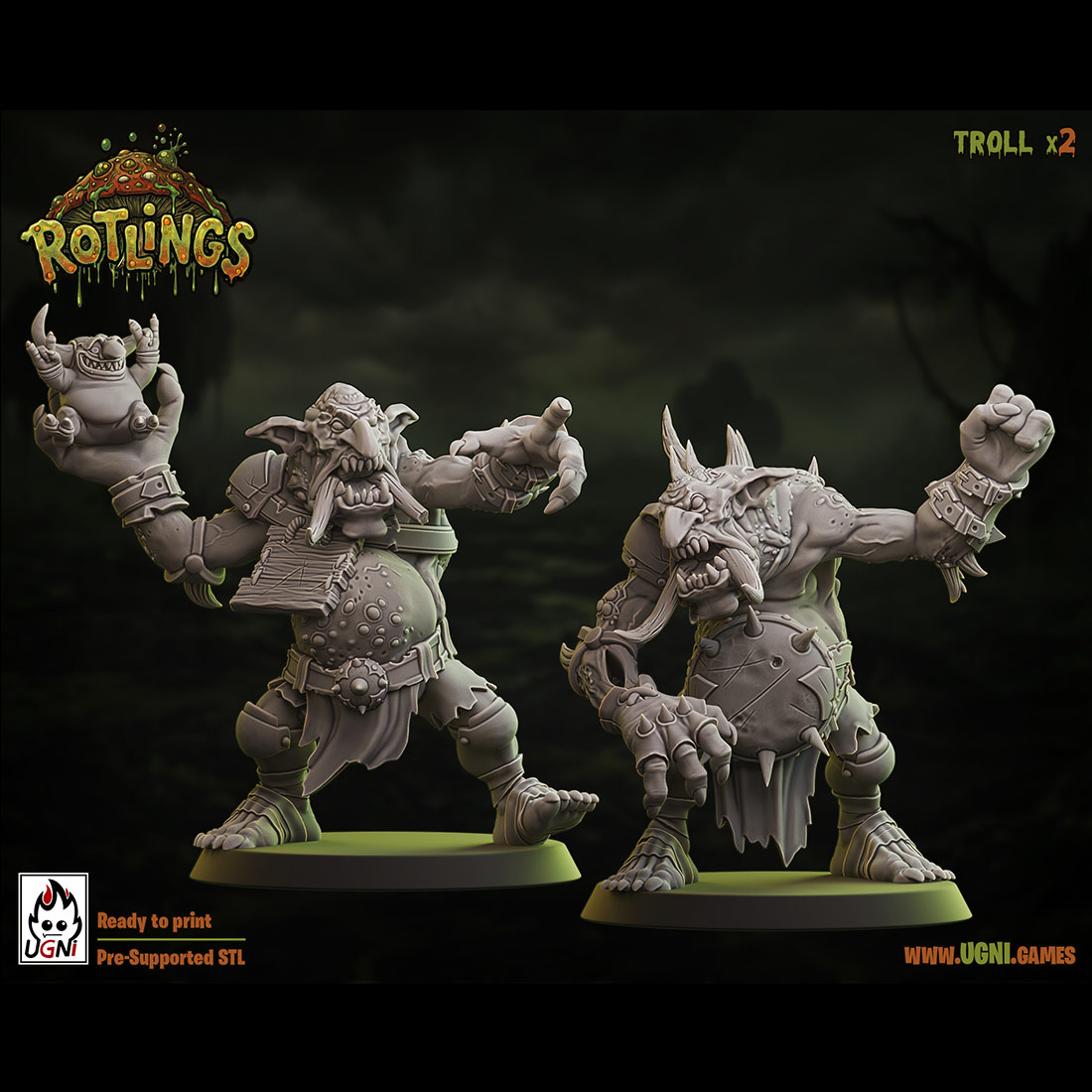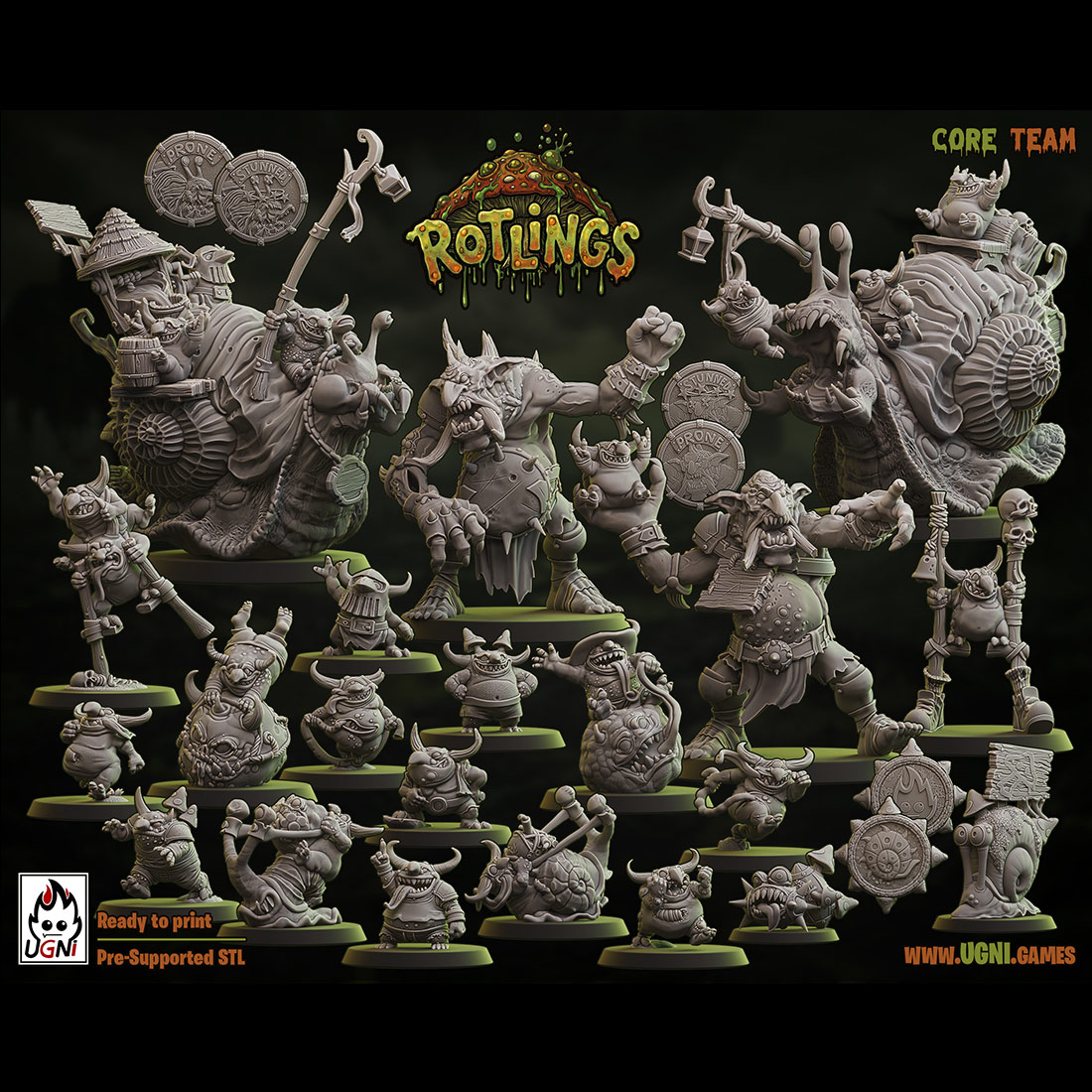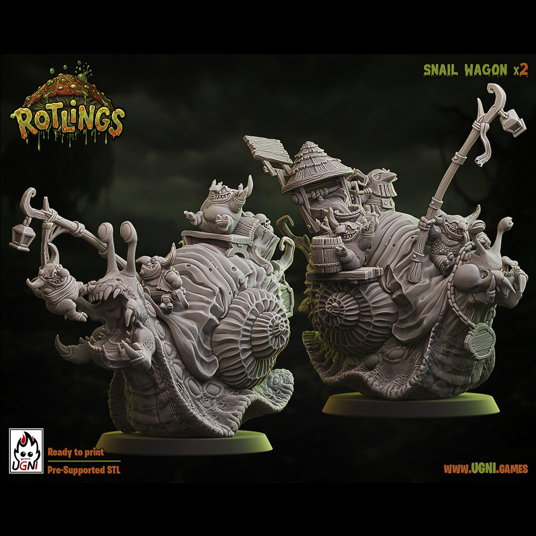 Figurines conçues par la marque Ugni miniatures et imprimées en 3D. Chaque figurine est fournie avec un socle rond de 32mm, les trolls et wagons escargots sont fournis avec un socle rond de 40mm. Figurines non peintes.