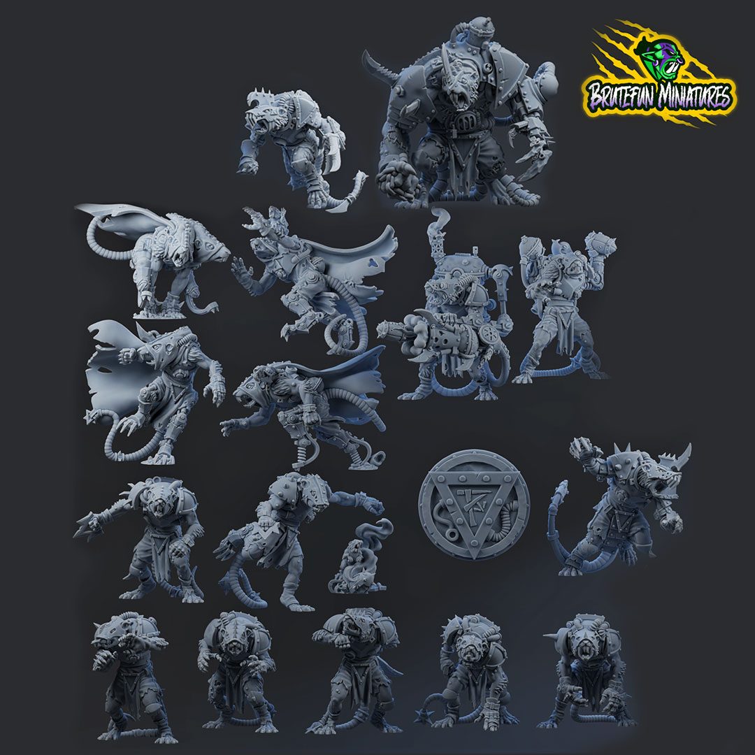 Figurines conçues par la marque BruteFun miniatures et imprimées en 3D. Chaque figurine est fournie avec 1 socle rond de 32mm. Le rat-ogre est fourni avec un socle rond de 40mm. Figurines non peintes